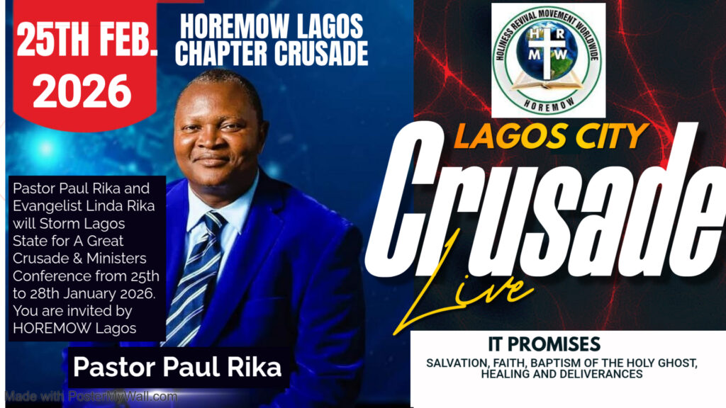 Pastor Paul Rika and Evangelist Linda Rika will Storm Lagos State for A Great Crusade & Ministers Conference from 25th to 28th January 2026. You are invited by HOREMOW Lagos State Chapter: WhatsApp contact +2348038425610, +2348138573531